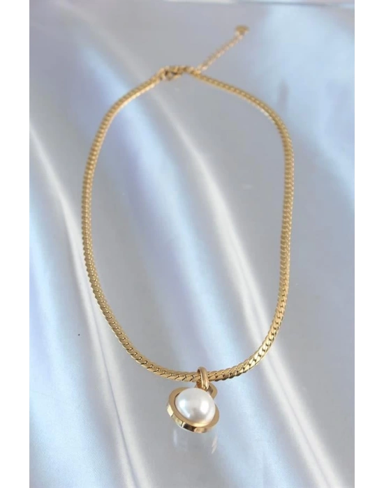 316L Çelik Gold Renk Yassı Zincir İnci Taşlı Kolye