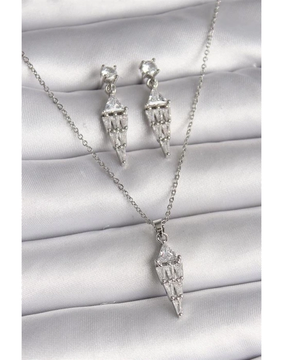 Pirinç Gümüş Renk Su Yolu Zirkon Taşlı VIP Seri Kadın Kolye Seti