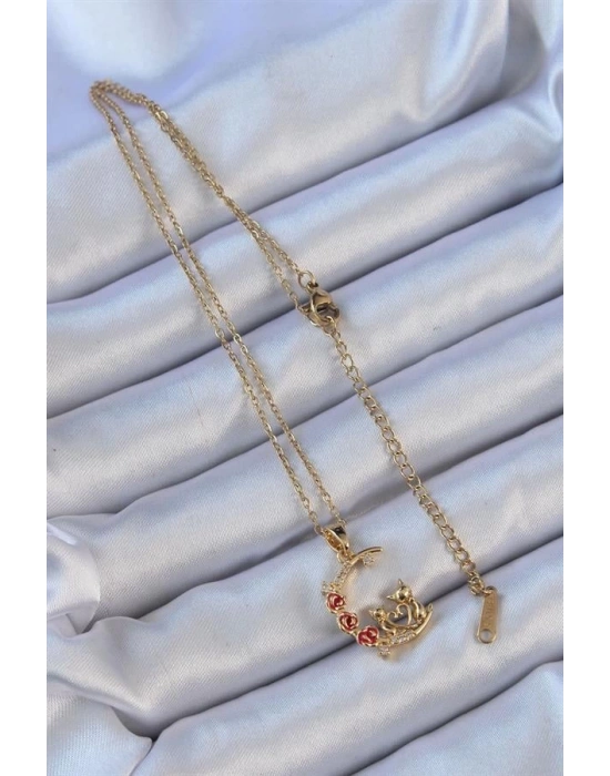316L Çelik Zincir Altın Renk Kırmızı Gül Detay Kedi Figür Zirkon Taşlı Ay Kolye