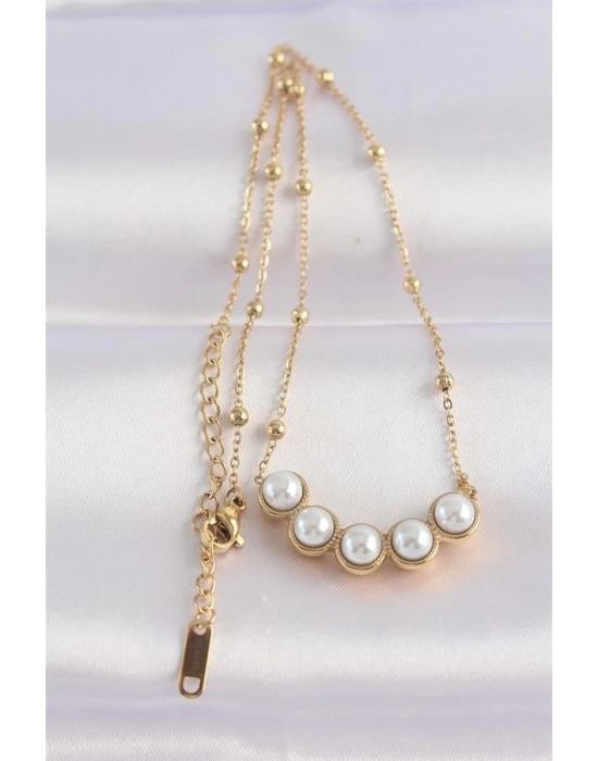 316L Çelik Zincir Altın Renk Sıralı İnci Taşlı Kolye