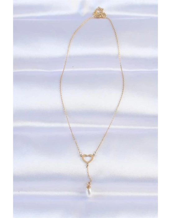 316L Çelik Zincir Gold Renk İnci Taş Detay Kalp Kolye