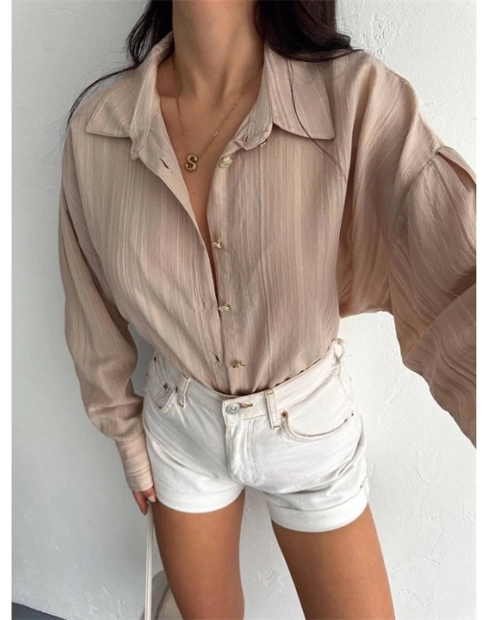 125005 Kolu Katlanabilir Hakim Yaka Kelebek Detaylı Müslin Kadın Gömlek Bej