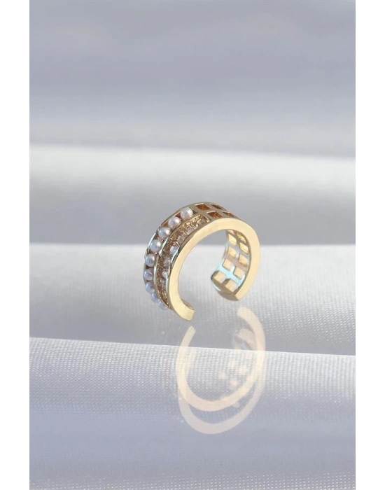 Pirinç Gold Renk İncili Baget Taşlı Earcuff Küpe
